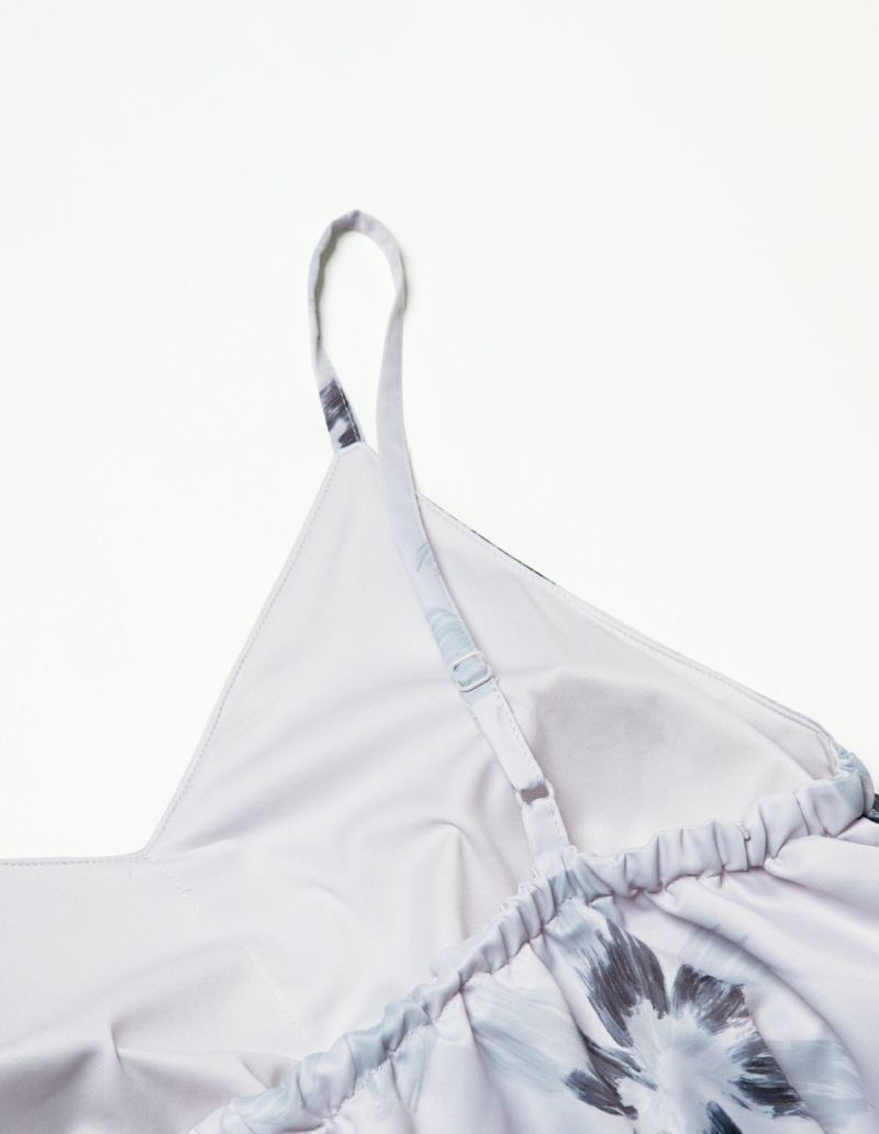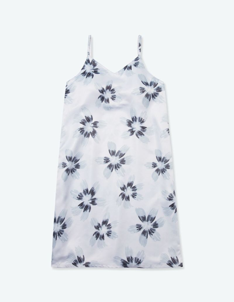 光でうつしとった花弁をイメージして大胆に描かれたフラワープリントワンピースセット。パット付きのキャミソール とのセットでそれぞれ着回しのきくアイテム。微光沢のサテン生地がさらりとした肌触りで、シーズンレスに着用可能な素材です。おそろいで着られるペアパジャマとして誕生日のギフト、結婚祝いなど様々なお祝いシーンにもおすすめ。