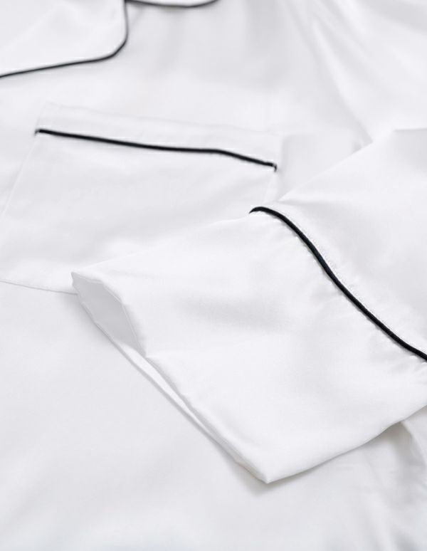 パジャマに合わせシルクライクな光沢で高級感のあるパッケージ入りでギフトに最適。シルク100%の肌触り絶妙なぜいたくパジャマです。 シンプルなデザインですが、ボリュームがありゆったりと着られるシルク100%パジャマ。深めのVネックは首元・胸元のシルエットを美しく演出します。シルクならではの素材の柔らかさがカラダののシルエットを美しく表現します。身頃にも十分に生地を取っていますのでラグジュアリーな印象を与えます。品質向上のため縫製を強化し、さらに長くお使いいただけるようリニューアルいたしました。リニューアル後はトップスのサイドスリットはありません。